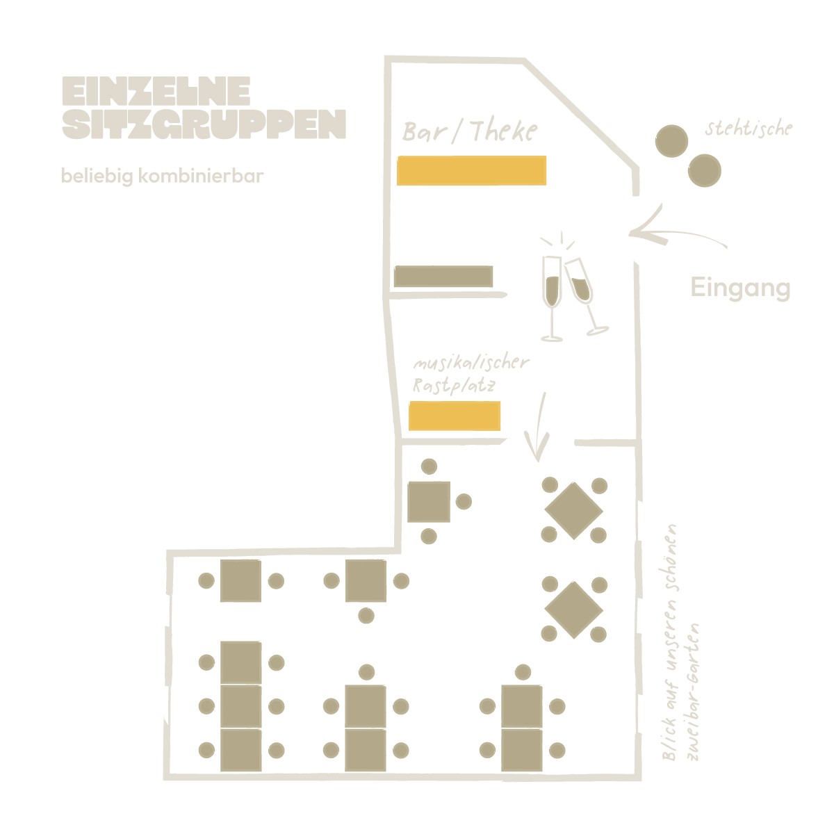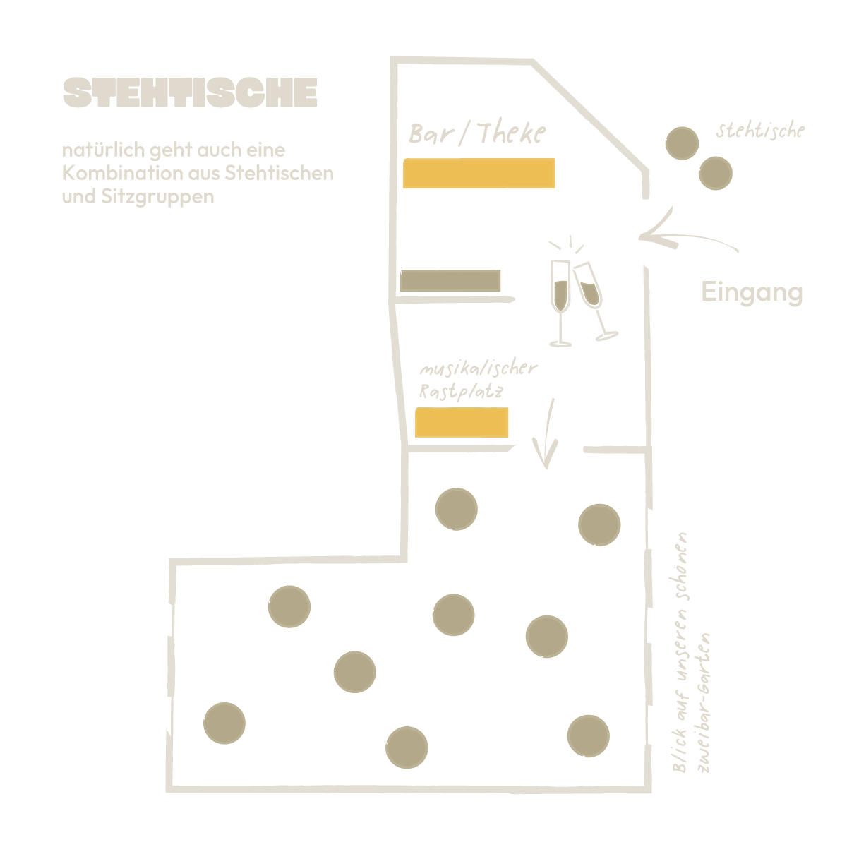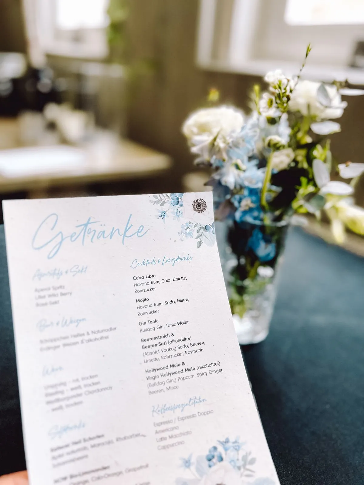 • Individuelle Getränkekarte mit deinen liebsten Drinks. Auch nehmen wir gerne deinen Lieblingsdrink für deinen Tag auf die Karte.